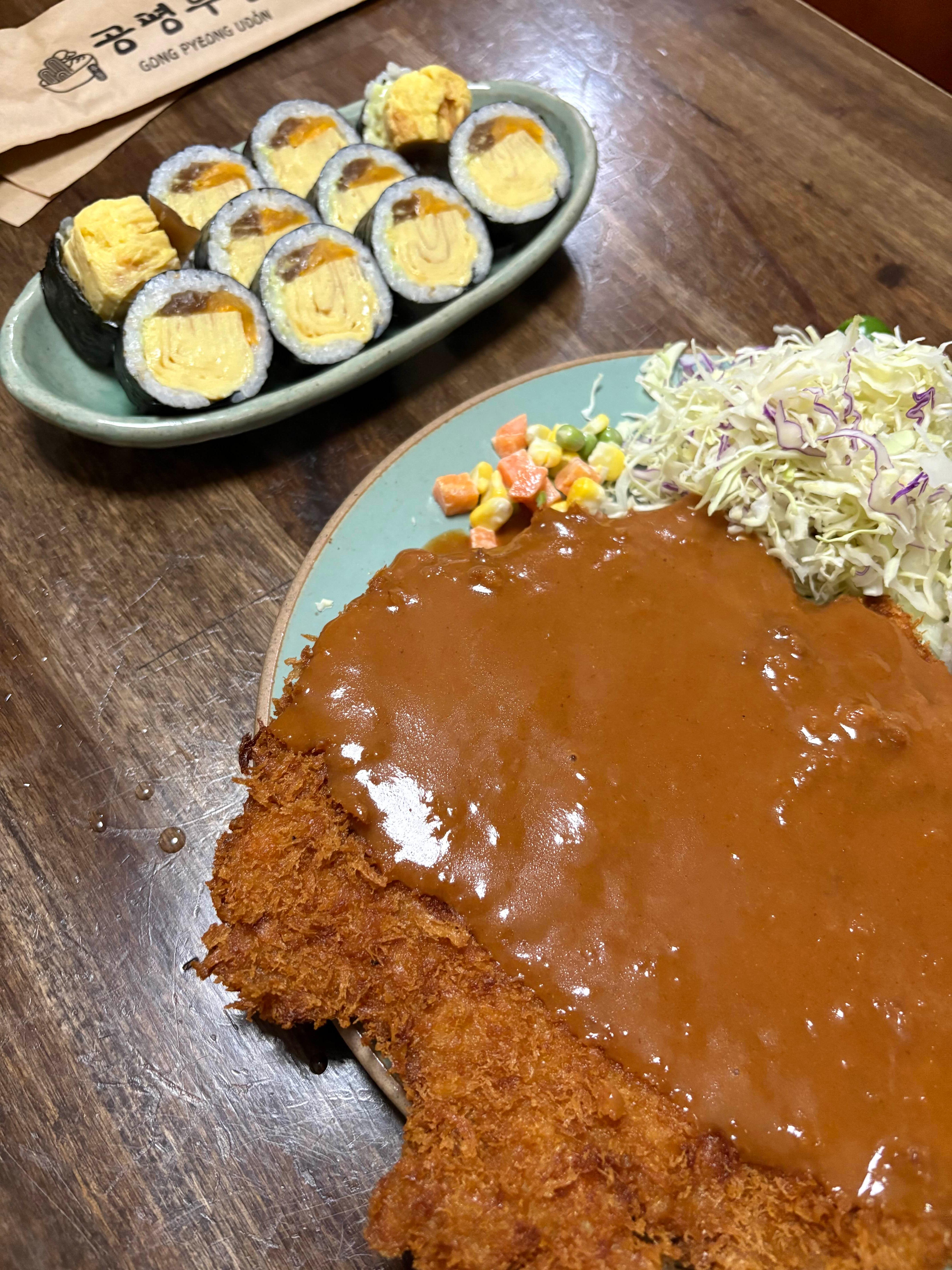 비빔우동은 품절이어서 그냥 공평우동, 수제왕돈가스, 계란김밥 주문했어요