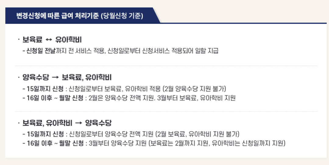 사전신청 종류 후 2월 28일(금) 16:00 ~ 24:00 기간동안 보육료, 유아햑비, 양육수당, 부모급여, 아동수당 서비스 신청이 중단된다고 해요